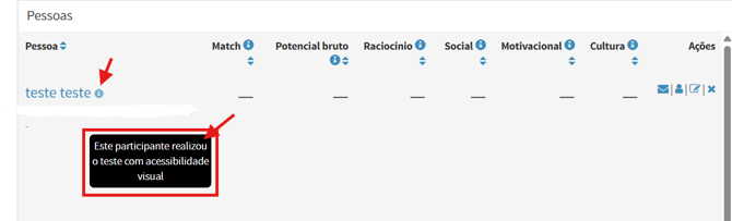Quando o candidato utiliza algum recurso de acessibilidade, a plataforma registra essa informação automaticamente.