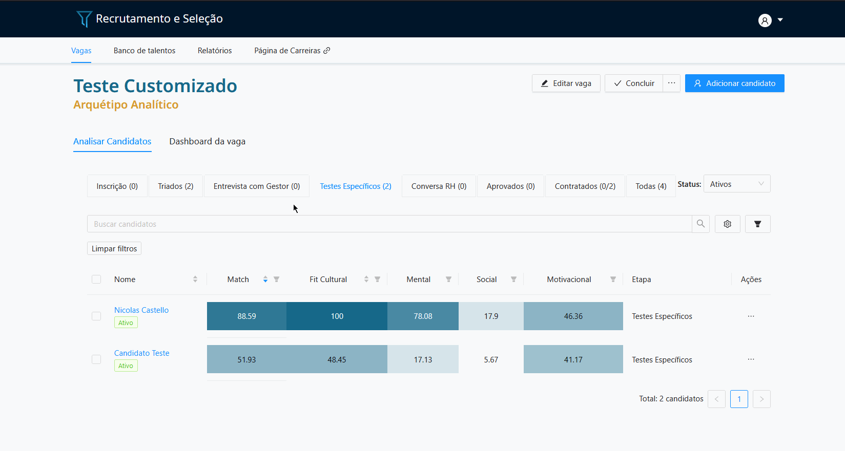 - Envio automático do teste customizado em uma determinada etapa. Precisa ser enviado por ação manual, em massa ou individualmente.